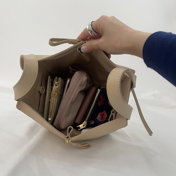 「ハンモック」の中で最も小さいミニサイズは、コロンとしたフォルムが強調されたデザインが特徴。サイドはドローストリングで絞る仕様になっており、垂らして使うとよりレディライクな印象で持てます。