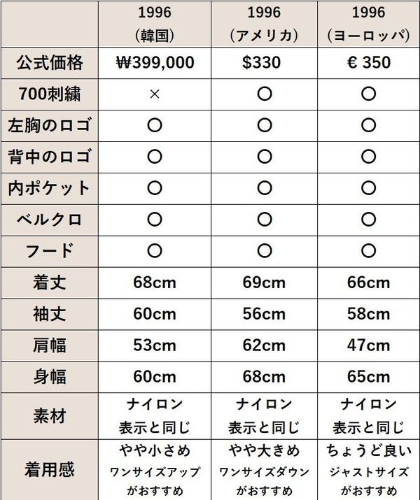└― ヌプシを格好良く着こなすためには的確なサイズ選びが欠かせませんが、オーバーサイズを選びすぎると不自然なシルエットに見えてしまうため、肩幅が自分の体型に合っているかどうかを確認するのはもちろんのこと、海外規格であればまずはじめに各国のサイズ&丈感の特徴をリサーチしておくことが重要。