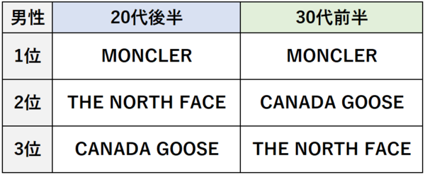 まずはアラサー男性に人気のダウンブランドを調べてみたところ、こんなランキングに。
