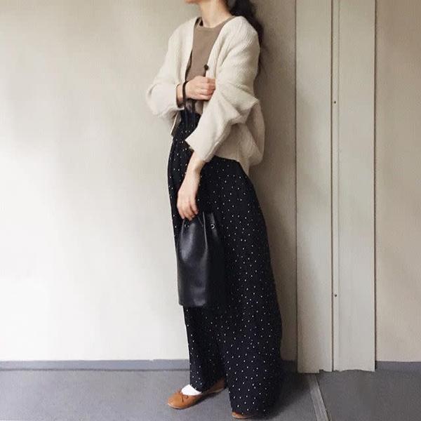 黒より華やかで、赤より落ち着いたキャメル。こんなブラックのワイドパンツも、キャメルのバレエシューズが品良くキュートに昇華してくれる。
