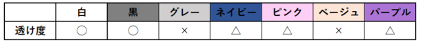 透けないと思い込んでいた‟白”や、つい手に取りがちな‟黒”。合わせるトップスにもよりますが意外と透けることも。