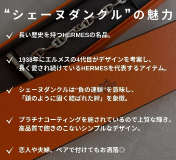 人気すぎて日本はもとより、世界中で品薄状態の「HERMES(エルメス)」シェーヌダンクル。手に入ったらみんなに自慢できるかもしれません。いつも頑張っているご褒美に、恋人や夫婦でペアで付けてもお洒落です。ぜひあたなにピッタリのシェーヌダンクルを見つけてくださいね。