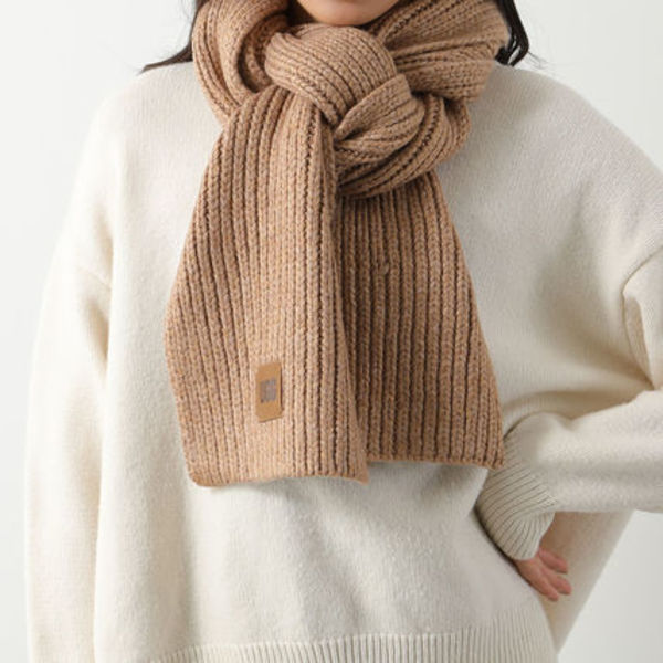 ∟ふんわりとした柔らかな肌触りに定評がある「LOEWE(ロエベ)」のマフラー。ニュートラルカラーにあしらわれた“モノグラム”入りのレザーパッチが洗練度を高めてくれます。