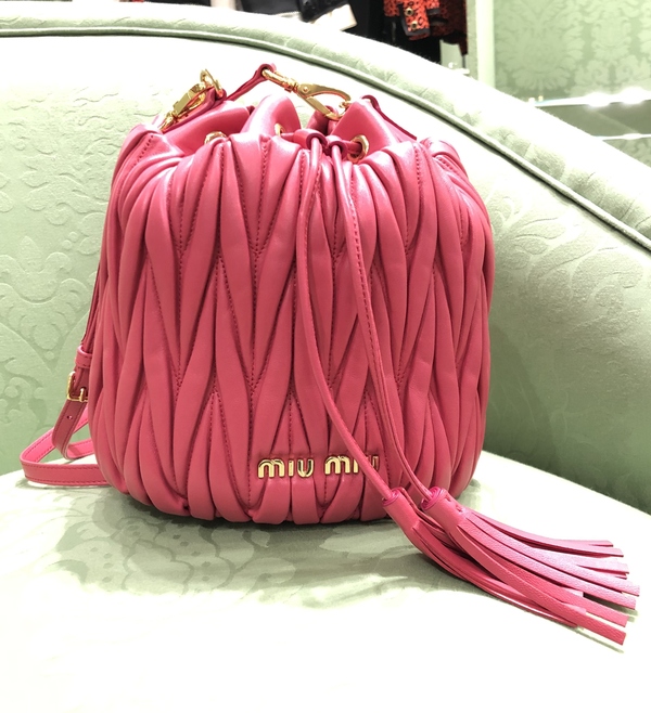女性のあこがれミュウミュウからは、ふっくらとしたマトラッセレザーが使用されたかわいらしいデザインのフェミニンなバケツ型バッグが登場。他のブランドにはないちょっとエレガンスなデザインなので普段から女性らしいコーデが多い方にはぴったりですよ。