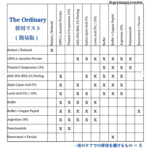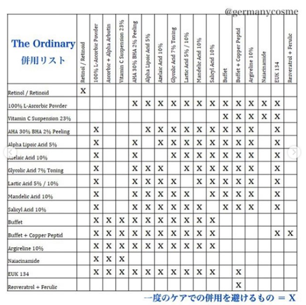 オーディナリーの代表的な製品同士の組み合わせで、「何を併用するのがダメなのか」を表でわかりやすく表したリストなんです!