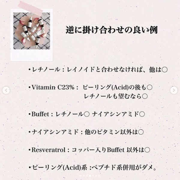典型的な例が、ピュアビタミン✖️レチノールね。これは前も書いたけど、一緒に使ってもいいけど、PH値の問題で、二つ一緒に使うと各々の効果が正しく発揮されないこともある、っていうだけで、使いたい人は使ってもよいのです。