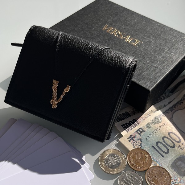 VERSACE(ヴェルサーチェ)のVロゴが光る二つ折り財布は、カード収納たっぷりでお札入れや小銭入れもばっちり。高級感のあるデザインとポケットに入る大きさで実用性も抜群です。
