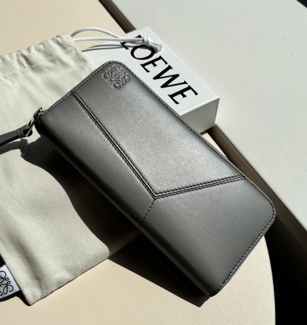 ∟「ロエベ」のお財布は、独自のデザインが巧みに落とし込まれているのが特徴的!幾何学的な模様の「パズル」や、大きなアナグラムロゴをデボス加工で施したアイテムが特に人気です。