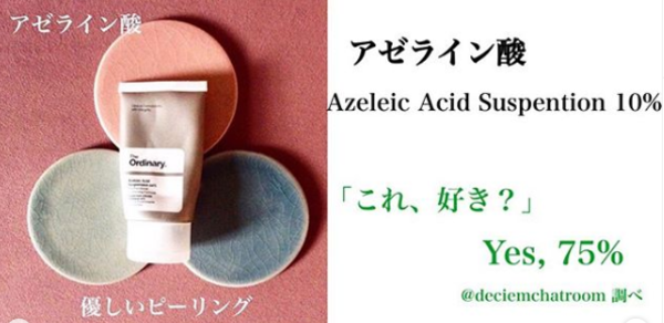 ヒトの肌にも含まれる大麦の酸から作った ピーリングで、敏感肌でも使える。クリーム状のテクスチャーが使いやすい。 The Ordinaryでは、シミ・美白ラインとしても紹介されている。一般的にニキビにも効くとされる成分。効果はマイルドですが、クセになる商品。朝も使えます。