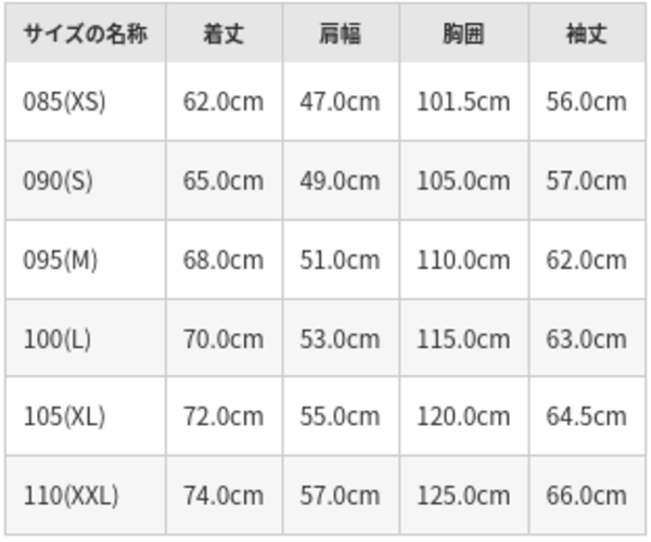 今回購入したサイズ以外にも、XS、XL、XXLなどのサイズもあるので、こちらのサイズ表を購入の参考にしてみてください。