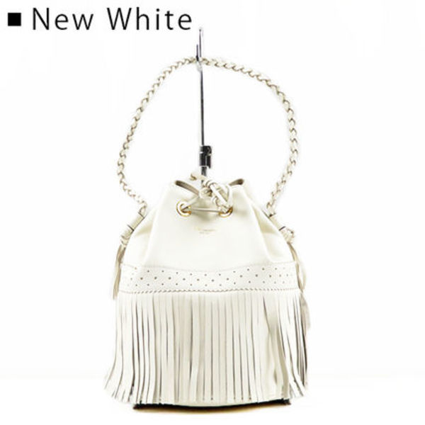 揺れるフリンジが目を引くデザインの巾着型バッグ。