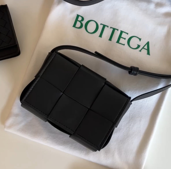 黒と緑のツートーンがボッテガっぽくてとても可愛い。サイズ感はスマホ、ミニ財布、その他小物類が収まるぐらいで、実用性もあり満足しています。他のカセット類は、ツートーンタイプになると一気にお値段が上がるので、このタイプを見つけられて良かったです。