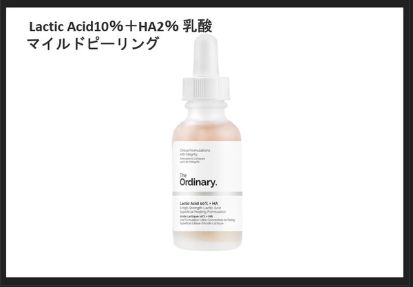 普通の乳酸10%+ HA 2%の優しいピーリングで優れた角質除去が出来る、洗い流さないピーリング。毎日使用OK、レチノールや他ビタミン入りのセラムとも併用OKです。