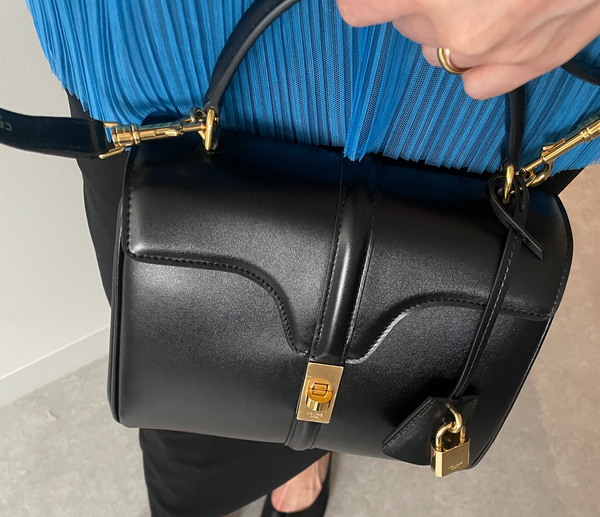 斜めがけも手持ちも出来き、コンパクト財布、携帯、コスメポーチが入る丁度良いサイズ。主張が強すぎず、分かる人にしかわからないブランドなので使いやすい。