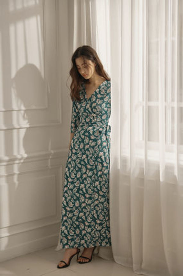 ▽エキゾチックなカフタンドレスは、一枚で主役級な目を惹きます。自然なVネックが、女性らしい美しさを引き立てます。夏らしいボタニカルを使ったモチーフで、流行に左右されないデザイン。