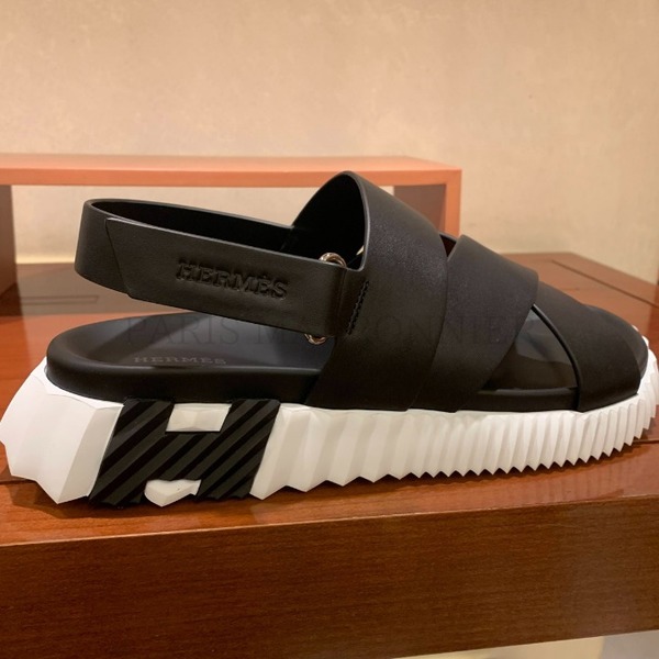 レザーバンドがクロスしたデザインサンダルが狙い目のHERMES。ブランドイニシャルをアピールするかしないか、お好みの一足をチョイス。