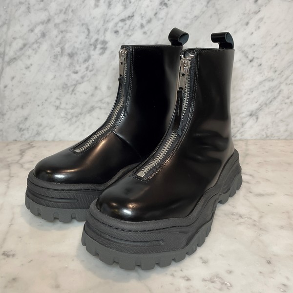The Row(ザ ロウ)のディテールに対する卓越した審美眼が光ります。シルバートーンのフロントファスナーがポイントで、適度なグレイン加工を施したレザーを使用し、端正なルックスが特徴です。厚さのあるラバープラットフォームソールとラウンドトゥのチャンキーなシルエットが、目を惹きます♡