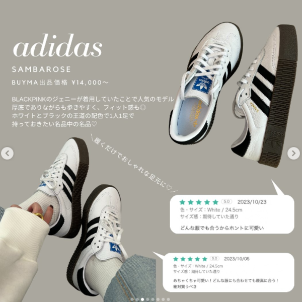 adidas(アディダス)が手掛ける「SAMBAROSE(サンバローズ)」は、韓国のアイドルグループBLACKPINK(ブラックピンク)のジェニーが履いていたことでも話題を呼んだ人気モデル。厚底でありながらも歩きやすく、ホワイト×ブラックの汎用性の高いルックスが支持されています。