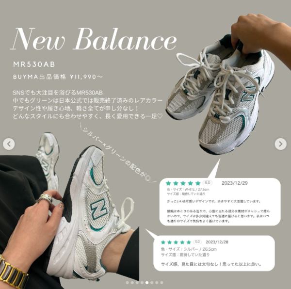New Balance(ニューバランス)の「MR530AB」はSNS上でも散見している超人気モデル。洗練されたデザインと優れた機能性を兼備しているのが特徴で、数あるバリエーションのなかでもこのシルバー×グリーンの組み合わせは公式サイトで入手することができないレアカラーです。