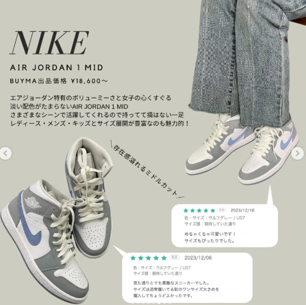 ナイキといえばこのモデル思い浮かべる方も多いのは!?アイコンスニーカー「AIR JORDAN 1(エアジョーダンワン)」。アイコニックなデザインと豊富なカラー展開でおしゃれ女子の間でも人気が高いモデルです。淡いグレーやブルーを合わせた上品なカラーリングが人気急上昇中です!