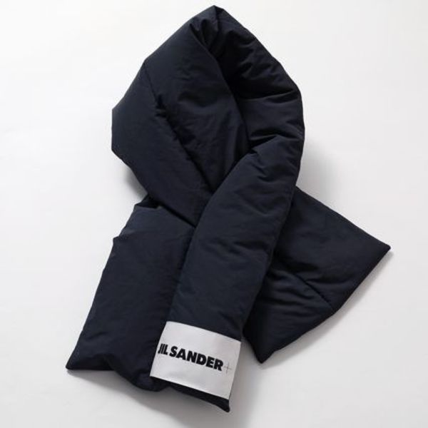 ▲続いてピックアップするのは、「Jil Sander(ジルサンダー)」の ダウンマフラー。マフラーに刻まれているロゴなどは小さめのものが多いですが、こちらは遠くからでも目をひくサイズ感が特徴的です。