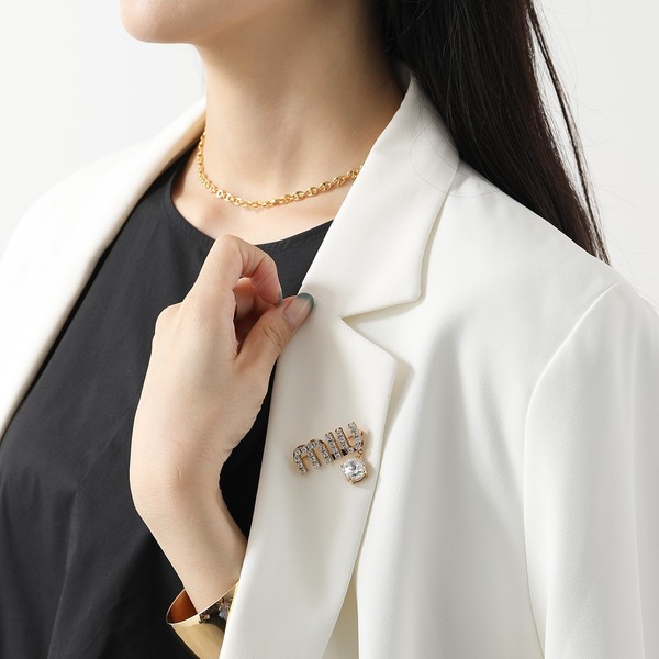 PRADAの大人気姉妹ブランド、ミュウミュウ。キラキラ輝くクリスタルと、揺れる一粒のクリスタルが目を惹くフェミニンな印象のブローチ。クールなスーツジャケットに大人の可愛さをプラスしてくれます。