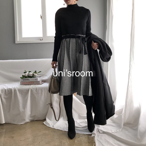 まずご紹介するのはこちらのリボン付きニットワンピース。素材はリブ編みなので、適度に身体にフィットするのがポイント高め。首元まで暖かく、機能の面でも冬にピッタリです。