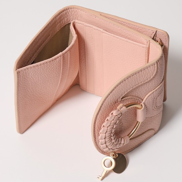 組みひもで飾った大きなリングとキーチャーム、ロゴメダルの組み合わせがインパクト抜群の二つ折り財布。フェミニンな雰囲気漂うピンクですが、大人の女性にもおすすめな落ち着いたトーンが特徴です。