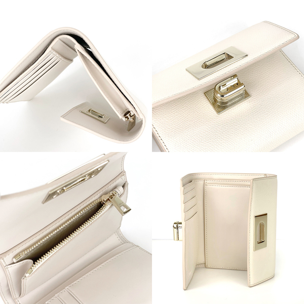 高級感溢れるレザーに金具づかいがおしゃれな三つ折り財布。ターンロック開閉式で小ぶりながらも、小銭、お札、カード、オープンポケットが備わった抜群の収納力が魅力です。定番カラーのブラック、ホワイトに加え、パステルカラーのピンクとブルーも揃っています。