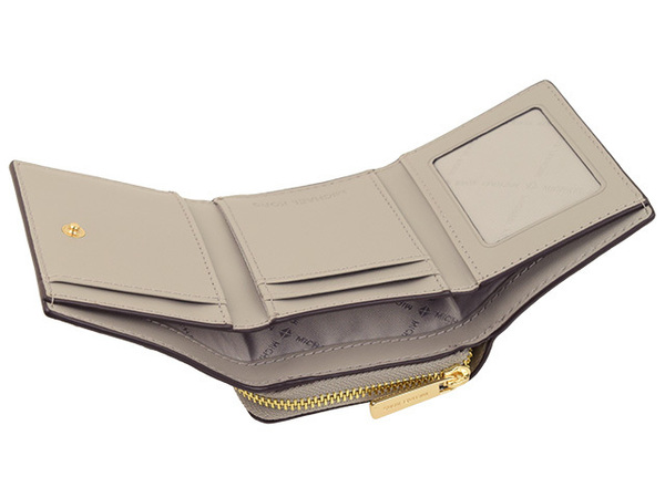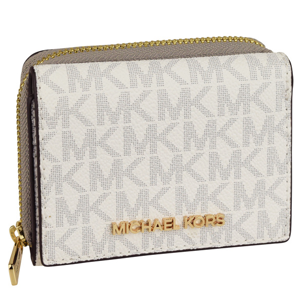 ホワイトのレザーに上品なMK柄とゴールドのブランドロゴををあしらったコンパクトな三つ折り財布。ミニバッグにもすっぽりと収まるサイズ感ながら、小銭もお札もカードも収納できる優秀なアイテムです。
