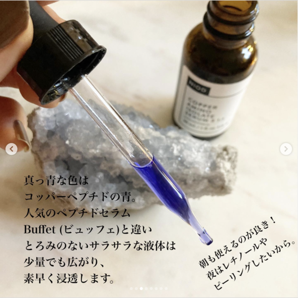 この成分が1%ずつ入ってることは非常にリッチな配分だそう。そしてこれ以外にもこれでもかっ!!ってほどの多種ペプチドが手を繋ぎ、この青いセラムの中に共存しています。