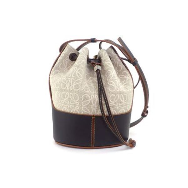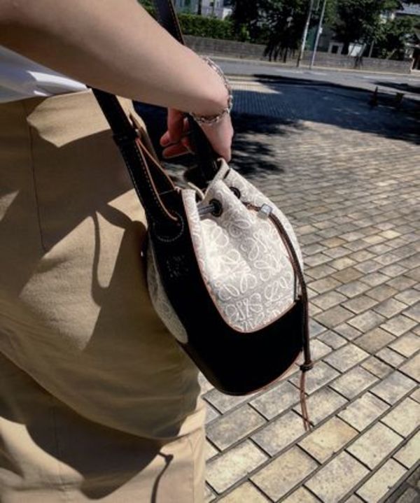 ▽ロエベのアナグラムが施されたキャンバスは、どこかクラシカルな雰囲気。デザイン性の高いキャンバス地とレザーが程良く使われた巾着タイプは、カジュアルながらも品の良さが滲み出ています。