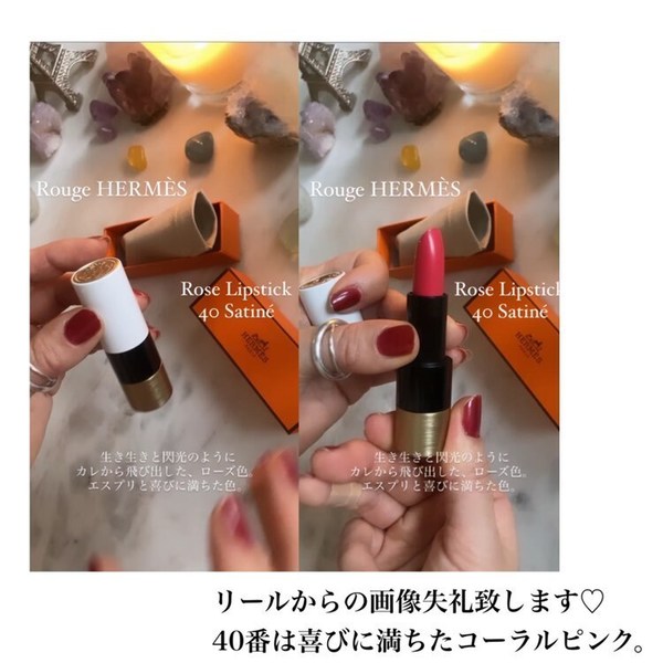 エルメスのリップは75000色のシルクの色から、たった24色を限定色として選んだそうなの。そしてこの40番のピンクは、エルメスの選んだ「ローズの中のローズ」