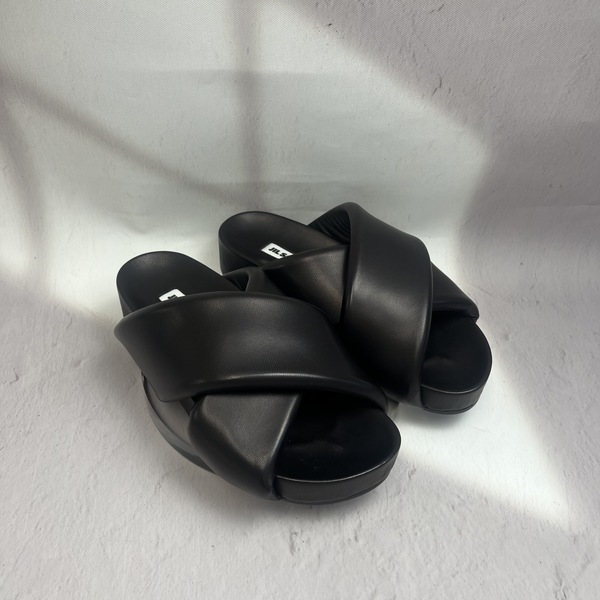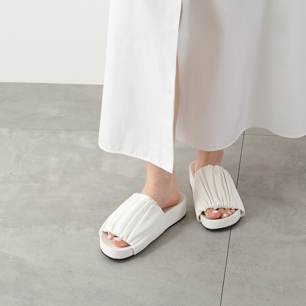 シャーリングディテールとオープントゥがポイントのスライドサンダル。ミニマルなデザインが魅力的で、艶のある滑らかなカーフレザーを使用し履き心地も快適。