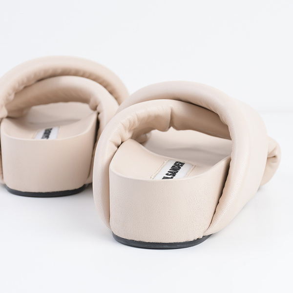 ストラップ部分にパットの入ったデザインで、ぷっくりとしたフォルムが魅力のクロスストラップサンダル。シンプルでありながらもボリューム感のあるシルエットで印象的な足元をつくります。「ちょっとそこまで」のお出かけにもサッと履ける気軽さもポイント!