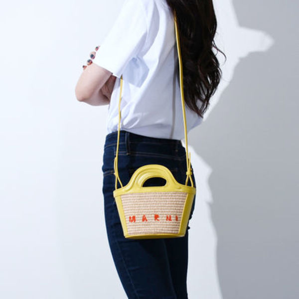シンプルなコーデも、マルニのかごバッグを1点投入するだけで陽気な雰囲気に。「トロピカル」という名の通り、アイキャッチーで旅の楽しさを彷彿とさせるデザインです。