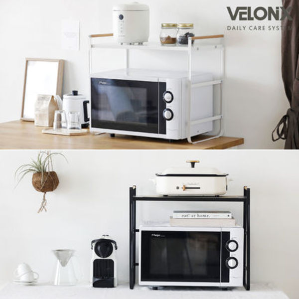 お色はホワイト/ブラックの2色。シンプルなデザインなので飽きがこないのと、収納する電化製品やお鍋のデザインとも喧嘩しません。