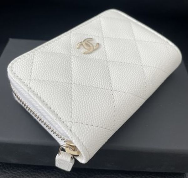 ▽ホワイトのキャビアスキンとゴールドのココマークが、クラシカルな佇まい。コインケースですが、仕切りが3つある仕様なので、ミニ財布としても使いやすいです。爽やかな白は、これからの季節にぴったりです◎