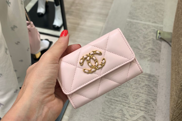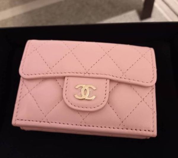 ▽こちらはラムスキン×チェーンロゴのライトピンク・ミニ財布。使い勝手の良い三つ折りタイプなので、最小限のカードと現金を一緒に持ちたい方におすすめです。