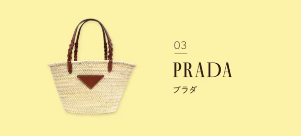 レザーで編み込まれたハンドルがシックな佇まい。PRADA(プラダ)を象徴する三角ロゴが、リュクスな表情を添えます。