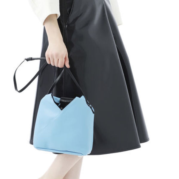 ▲こちらは軽くて柔らかい生地感が魅力のジャパニーズバッグ。メゾンを象徴する水平ステッチやスクエア型の底鋲がポイントになっています。爽やかなスカイブルーのカラーが夏の着こなしに映えること間違いなし。