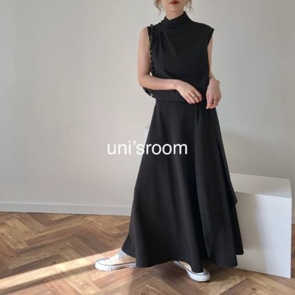 ブラックの生地なので写真だと少し見づらいですが、スカート部分がアシンメトリーなデザインとなっており、こなれ感を出せるオシャレさが唯一無二。