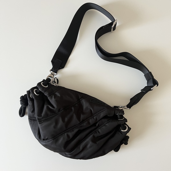 リサイクルポリエステルを使用して作られたクロスボディバッグ。ちょっとした外出にちょうど良いサイズ感で、夏の着こなしにも映えるデザインです。サイドのクシュッとしたシルエットと肩が痛くなりにくい太めのショルダーベルトが気に入りました。(BUYMAスタッフ/20代後半)