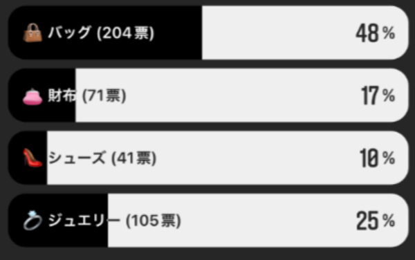 きれいめ派さんが多いTwitterのアンケート結果では、欲しいブランドとデザインが豊富に揃うバッグとジュエリーがほぼ独占して票を獲得する人気ぶり! 特にジュエリーは、タイムレスに愛用できるようなファインジュエリーに注目が集まっています。