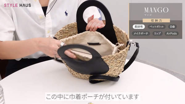 中身が丸見えになってしまい、防犯面からちょっと不安になりがちなカゴバッグですが、こちらは中に巾着が付いていて安心。