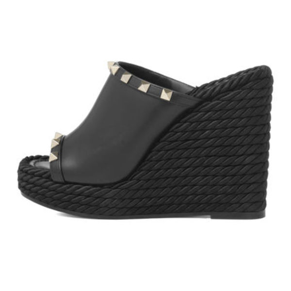 輝くゴールドスタッズが、ラグジュアリーな雰囲気を漂わせるウェッジサンダル。アッパーは上質なカーフスキンで仕上げられ、美しい艶が高級感溢れる表情を演出。