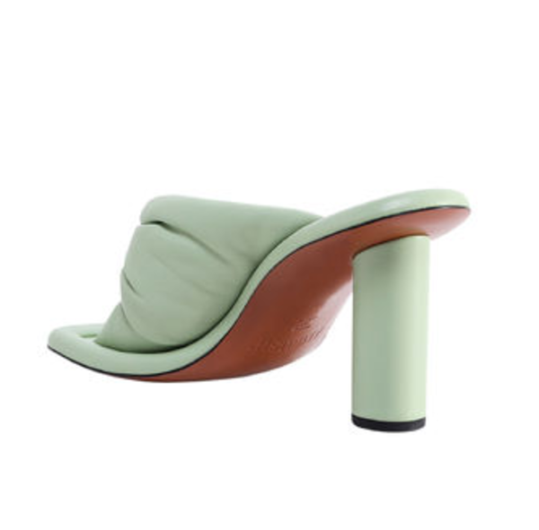 柔らかなミントグリーンで、甘さを抑え清涼感のある足元に。ぷっくりと立体的に仕立てられたリボンがアイコニック。