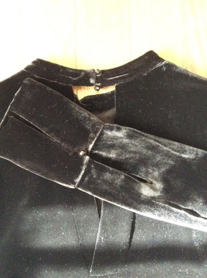 裏もしっかりついており、ネック後ろ、袖部分に黒のビーズボタンが付いています。