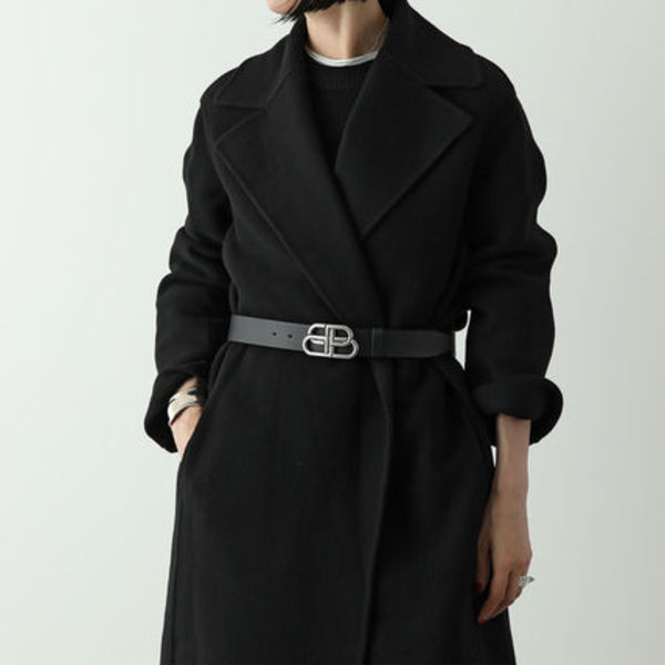 BALENCIAGA(バレンシアガ)のベルトは定番のカジュアルスタイルに取り入れるだけでも様になりますが、冬ならロングコートに上から着用するのがおしゃれ上級者。あえて無地のモノトーンを選ぶことでベルトが主役級の存在感を漂わせます。