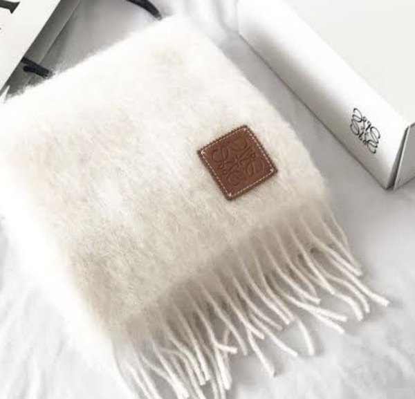 人気のLOEWE(ロエベ)から、モヘアマフラーをピックアップ。毛足が長く肌触りの柔らかなウールモヘア素材で、エッジにはフリンジがついています。アナグラムの型押しレザーパッチがアクセントに。